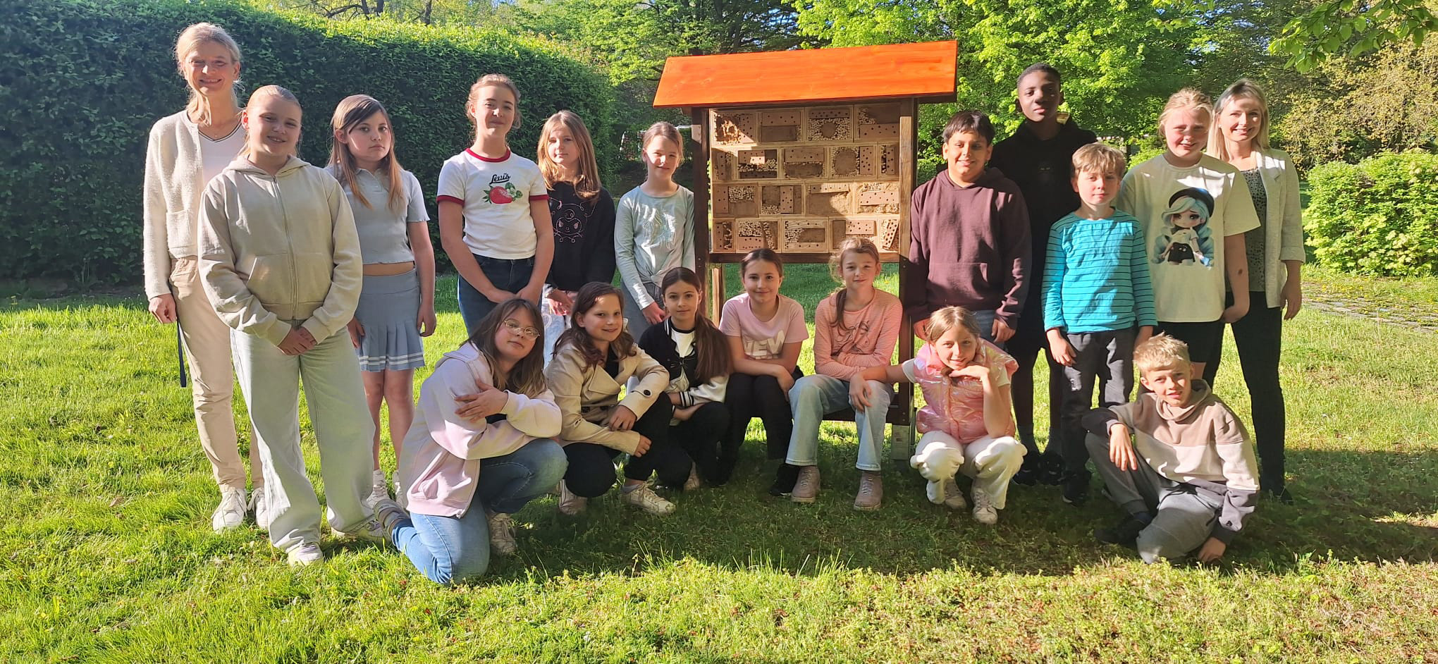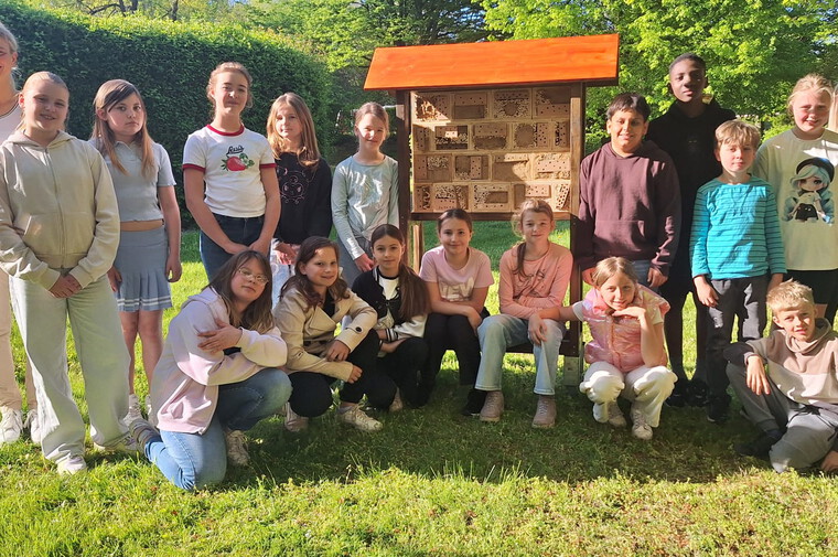 In den vier Stunden konnten die jungen Baumeister sogar das Gerüst des Insektenhotels anstreichen. Die einzelnen Module mussten noch trocknen, doch am 30. April 2025 war es dann soweit: Das fertige Insektenhotel wurde aufgestellt – ein tolles Gemeinschaftsprojekt, das nun den Schulgeländebereichert. Das beigefügte Foto zeigt den stolzen Moment mit dem fertigen Bauwerk.