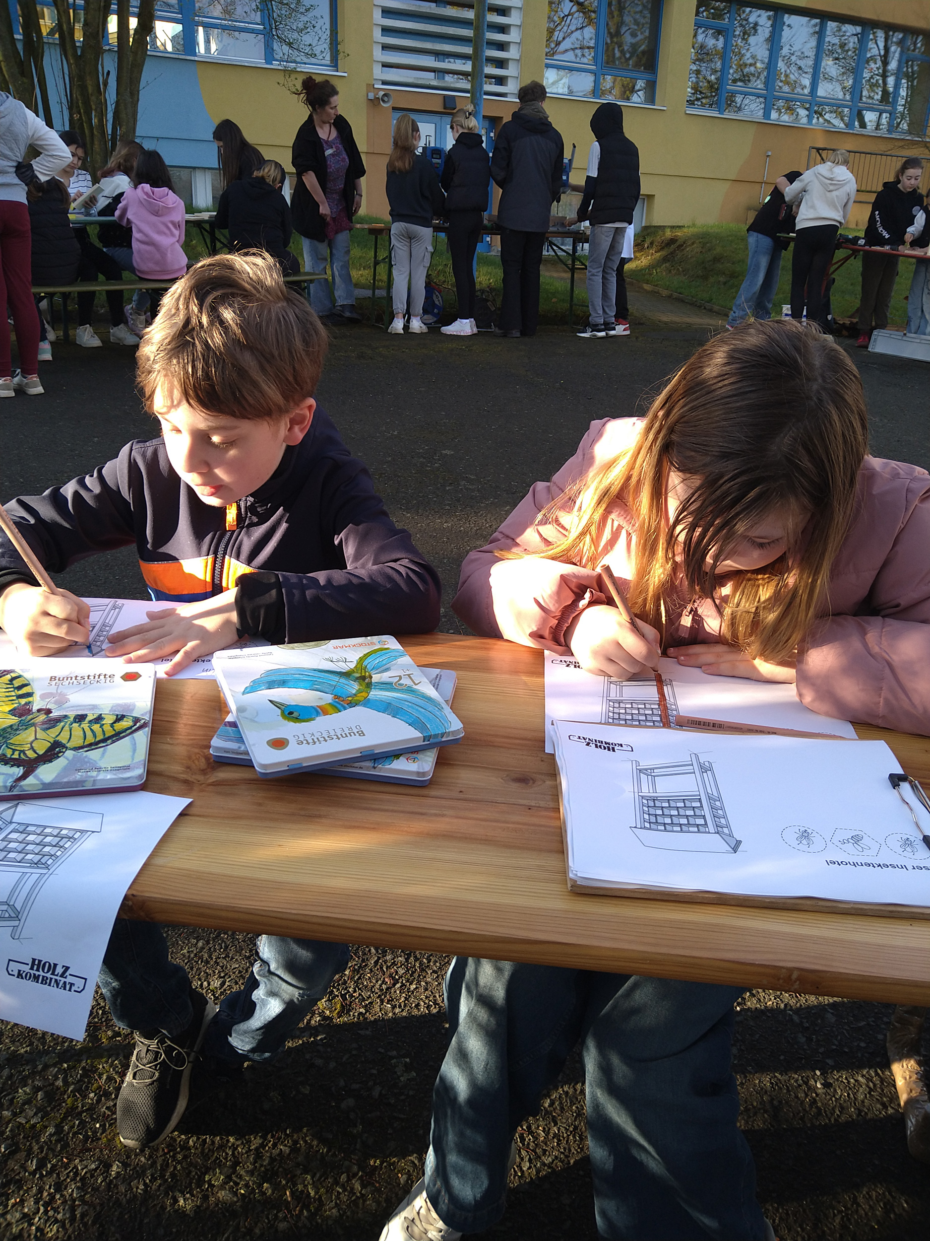 Gemeinsam mit ihrer Klassenlehrerin Frau Pohle und dem Holzkombinat aus Chemnitz tauchten die Kinder in die Welt des Holzhandwerks ein. Nach der Begrüßung wurden die Skizzen des Insektenhotels gezeigt und die verschiedenen Arbeitsschritte erklärt. Die Schüler wurden in kleine Gruppen eingeteilt, die an unterschiedlichen Stationen arbeiteten und so alle Schritte des Bauprozesses hautnah miterlebten.